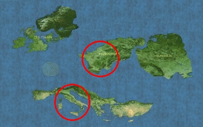 L'empire latin s'étendait jusqu'au quatrième siècle sur l'ensemble de Notikonos et de grands pans de Middenardh et de Ceiltigahn. La fin du quatrième siècle a vu la séparation de cet empire et l'émergence de l'empire murvien en Notikonos. Au cinquième siècle, ce sont les continents de Middenardh et de Ceiltigahn qui ont été perdus face aux Humains germains et aux Orcs angles. La péninsule asturienne en Notikonos a également été perdue au cours de ce siècle face aux envahisseurs Kerfenn.